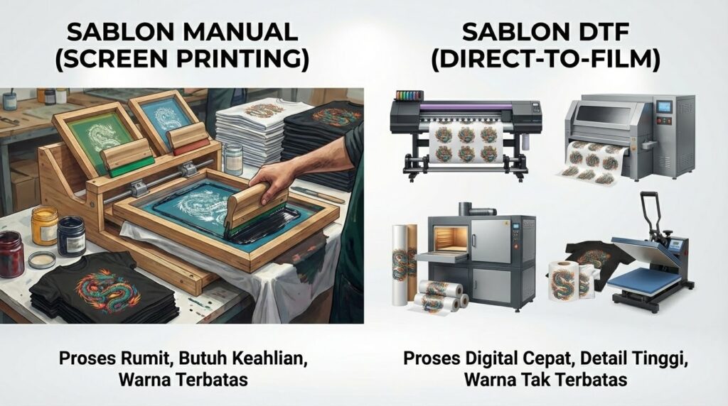 Berbeda dengan sablon manual yang membutuhkan screen, teknik ini lebih praktis karena langsung mencetak dari file digital. Teknologi ini berkembang pesat sejak 2019 dan kini menjadi pilihan favorit pelaku bisnis desain apparel di Indonesia.