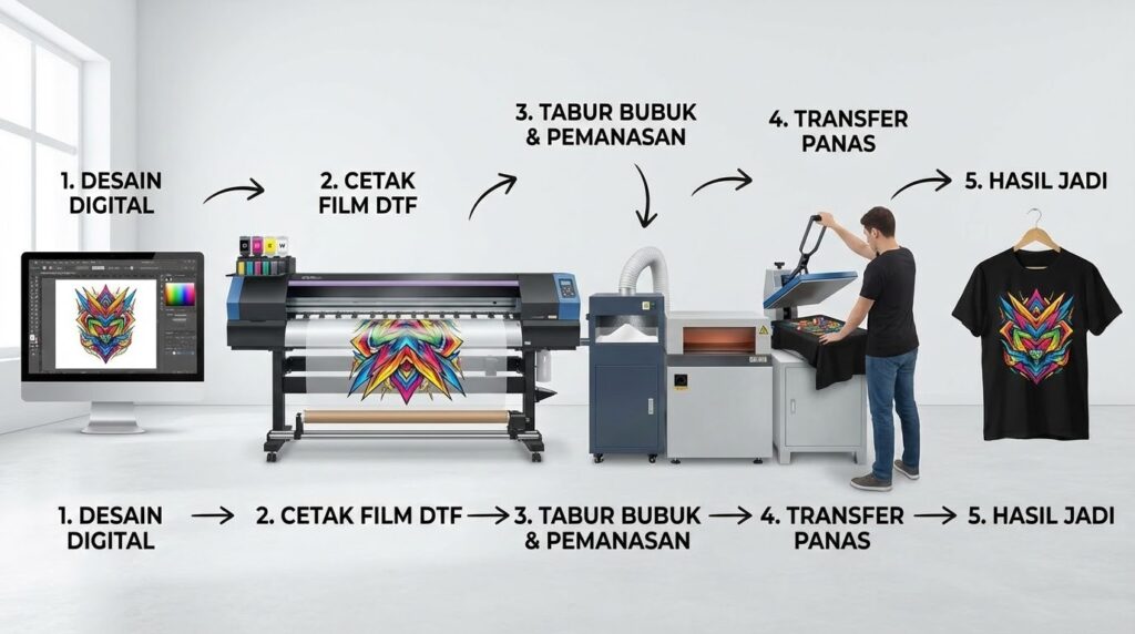 Proses sablon DTF terdiri dari lima tahap utama yang harus dilakukan berurutan untuk hasil optimal.