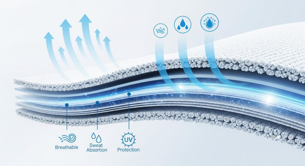 2. Ventilasi dan Pengaturan Suhu Bahan yang baik harus meningkatkan sirkulasi udara agar kulit tidak terlalu lembap. Hal ini krusial bagi atlet outdoor atau yang berlatih di iklim tropis.