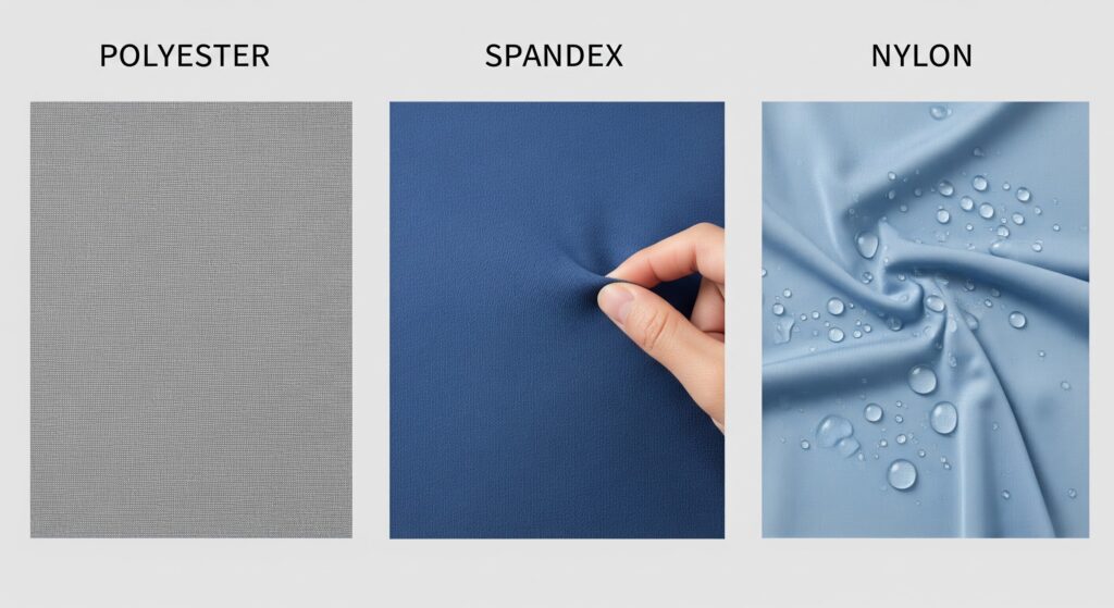 Bahan sportswear berbasis polyester menjadi pilihan paling populer karena sifatnya yang ringan dan cepat kering. Material ini mampu menahan aus dan robek, cocok untuk kegiatan intens atau penggunaan jangka panjang.