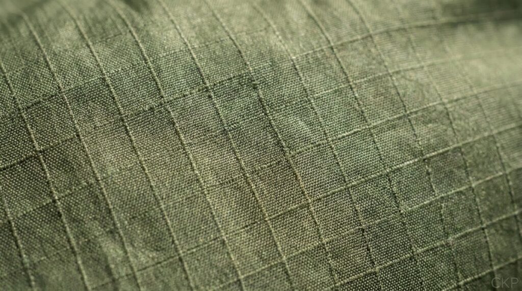 Untuk tenda perorangan dan perlengkapan yang harus dibawa sendiri oleh personel, nilon ripstop menjadi pilihan dominan. Struktur anyamannya yang khas, dengan pola grid yang terlihat di permukaan kain, dirancang agar robekan kecil tidak menjalar. Kain robek sedikit, berhenti di situ.