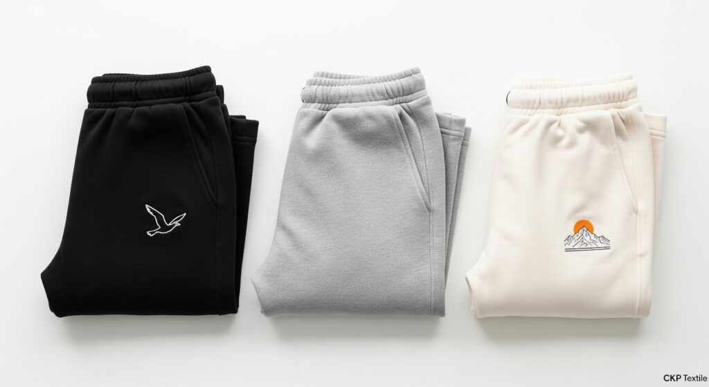1. Cotton Fleece — Lembut, hangat, dan menyerap keringat. Cocok untuk celana santai bergaya kasual. Gramasi ideal 240–280 gsm.