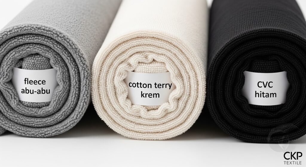 3. CVC (Cotton Viscose Cotton) — Campuran katun dan polyester yang tahan lama, tidak mudah kusut, dan tetap lembut. Pilihan terbaik untuk produksi massal sweatpants custom.