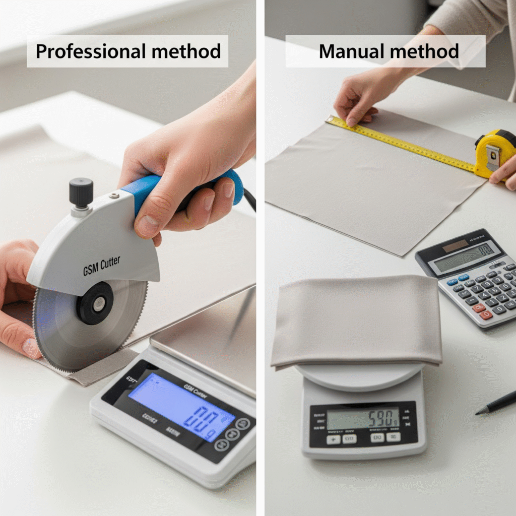 Dengan pengalaman, kamu bisa memperkirakan gramasi hanya dengan mengangkat dan meraba kain. Meski tidak seakurat alat, metode ini berguna untuk quick check di lapangan. Caranya: sering-sering pegang berbagai jenis kain dengan gramasi berbeda sampai terbiasa.