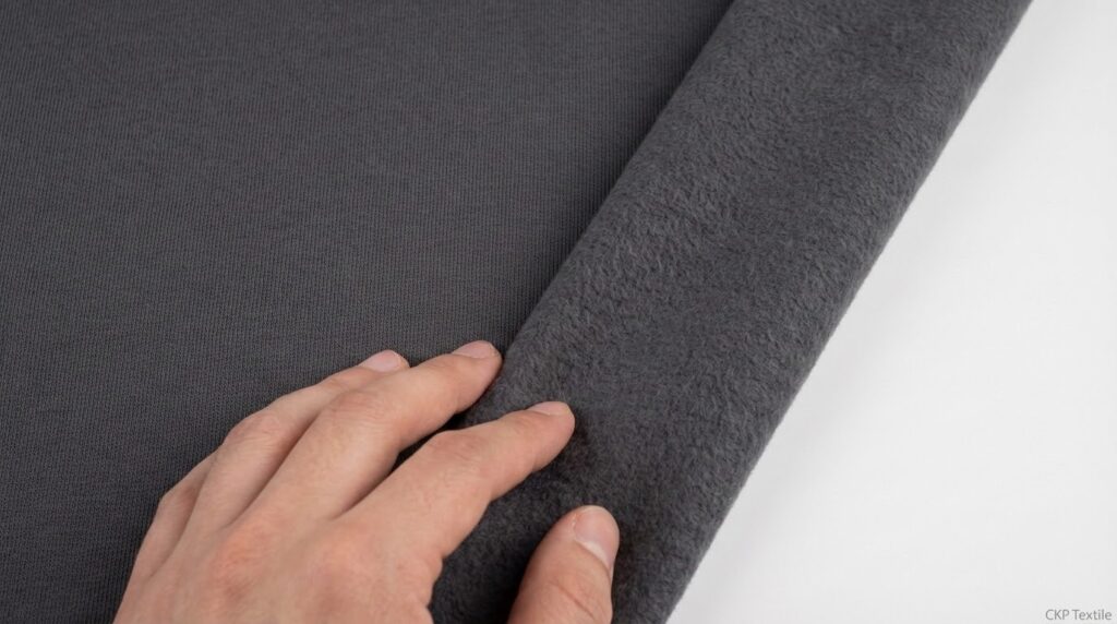 Cotton fleece adalah kain katun tebal paling populer untuk hoodie dan sweater. Permukaannya halus di luar dan berbulu lembut di dalam, memberikan efek hangat yang nyaman tanpa terasa berat. Gramasi umumnya antara 280 hingga 380 gsm.
