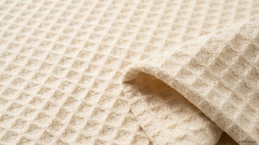 Katun waffle adalah kain katun tebal dengan pola timbul kotak-kotak (waffle knit) yang khas di permukaannya. Tekstur ini bukan hanya estetis, tapi juga fungsional karena meningkatkan sirkulasi udara sekaligus menjaga kehangatan lebih efisien.