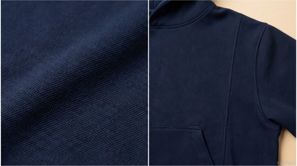 | Cotton Pique | 220-280 gsm | Butiran timbul, semi-formal | Hoodie premium, sweater kasual |