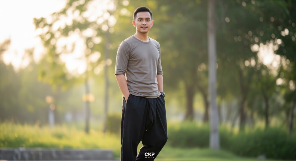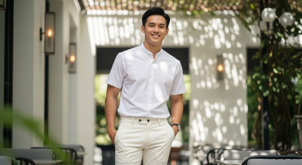 Padukan atasan bersih tersebut bersama bawahan berbahan tebal yang lentur seperti celana chino murni. Pilihan warna nuansa bumi seperti krem muda atau cokelat kayu sangat serasi menemani gaya atasan. Kombinasi outfit lebaran pria ini menegaskan identitas Anda sebagai pria modern pencinta kebersihan.