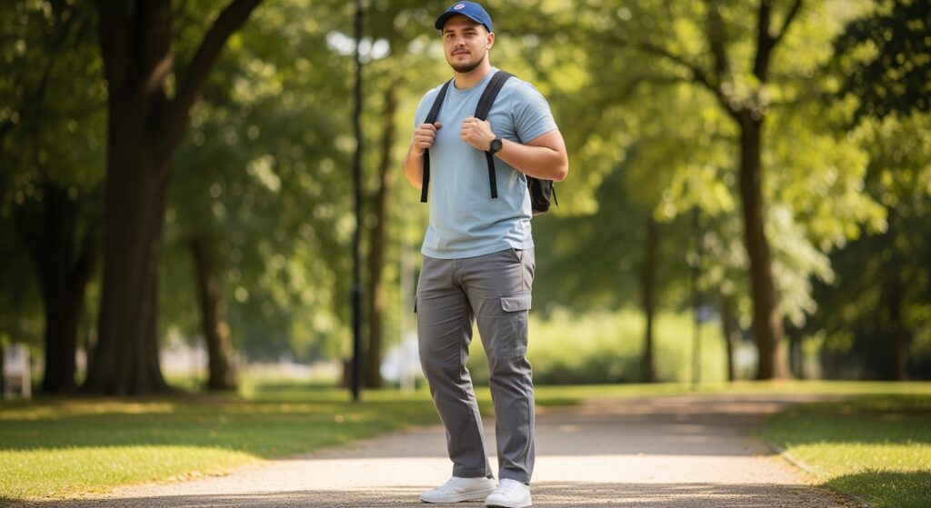 Outfit mudik pria paling praktis adalah kombinasi kaos oblong berbahan katun dengan celana panjang chino atau cargo. Tambahkan jaket ringan sebagai lapisan luar dan sepatu nyaman seperti sneakers atau slip-on sebagai alas kaki yang memudahkan kamu saat harus transit atau berjalan jauh.