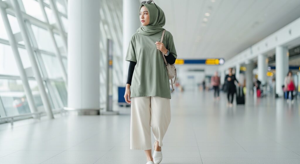 | Bus / Travel | Tunik longgar, celana panjang palazzo, jaket ringan, sepatu nyaman slip-on |