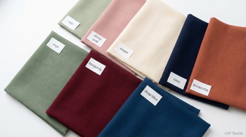 Warna earth tone seperti sage green, mocca, cream, dan beige mendominasi pasar busana muslim tahun ini. Warna pastel seperti dusty pink, baby blue, dan lavender juga naik daun karena fotogenik dan mudah dipadukan. Sementara warna bold seperti burgundy dan navy menjadi alternatif bagi yang ingin tampil lebih berkarakter.