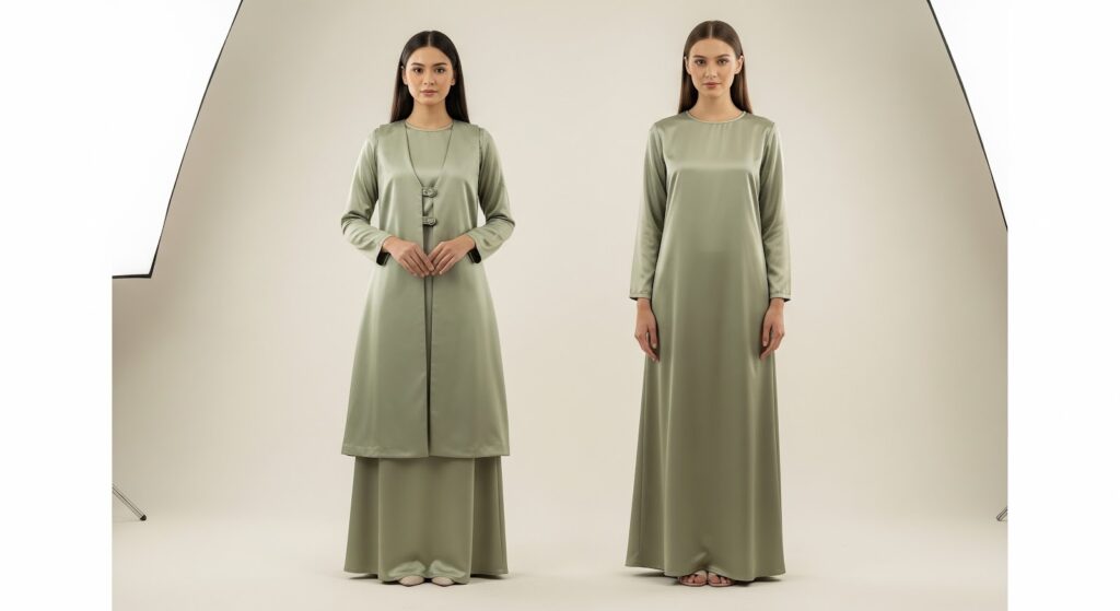 Baju lebaran model dress A-line berbahan armani silk atau satin menjadi tren untuk tampilan mewah di Hari Raya. Dress berlayer dengan aksen lipatan halus memberikan efek flowy yang anggun saat berjalan. Pilihan warna ivory dan champagne paling banyak dicari karena terlihat premium tanpa berlebihan.