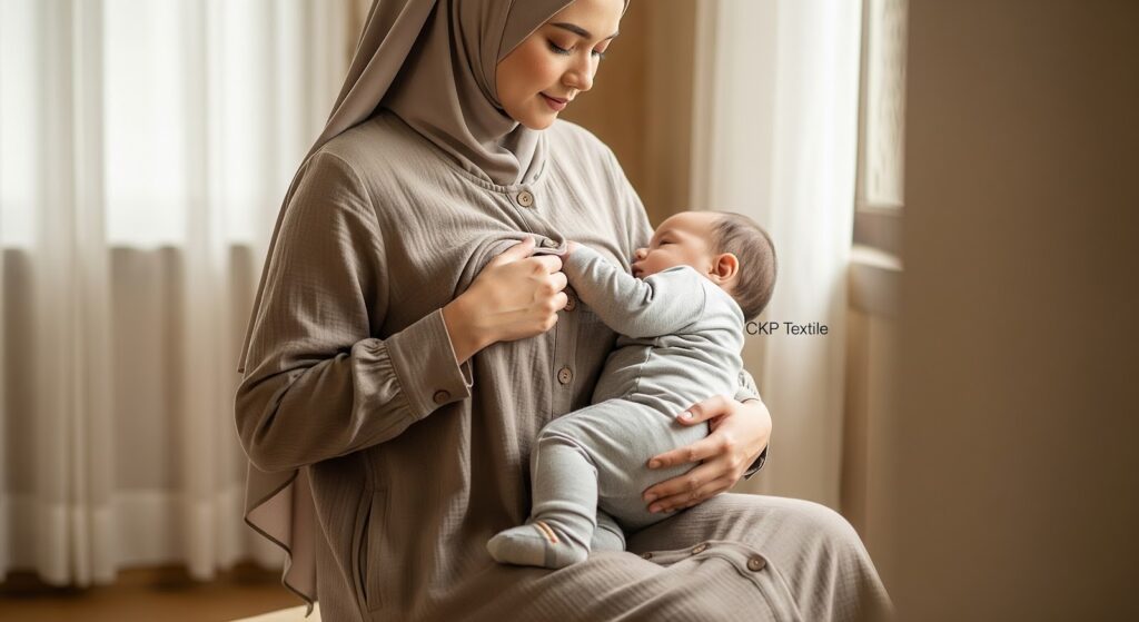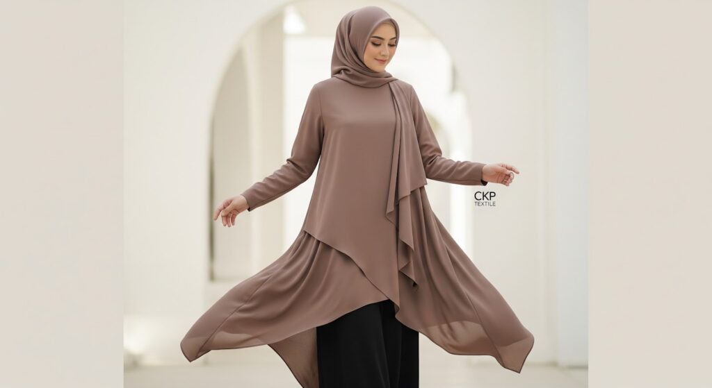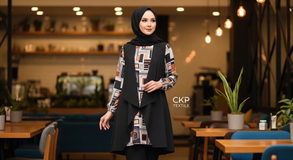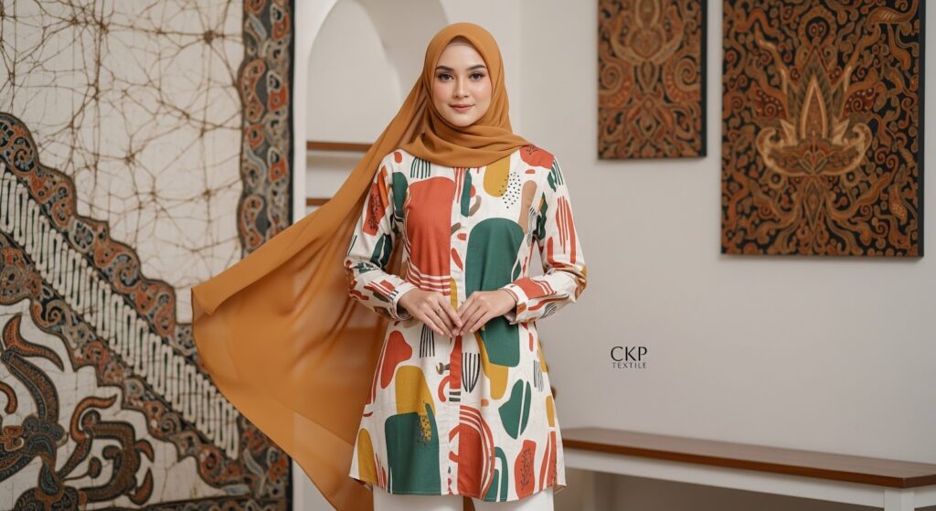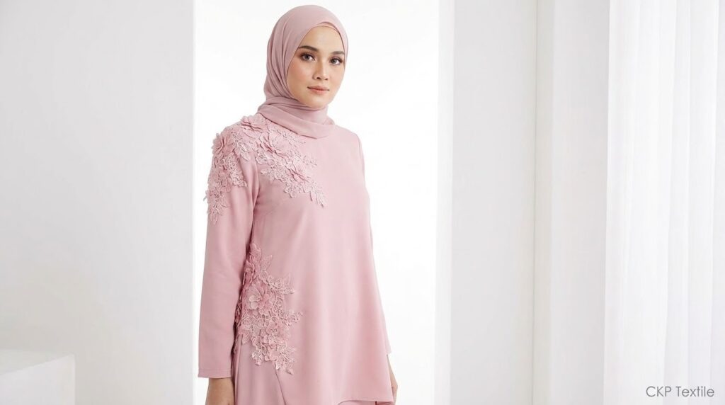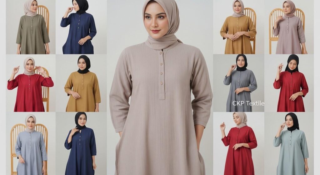 Bahan tunik lebaran sangat menentukan kenyamanan seharian. Untuk cuaca panas, pilih bahan menyerap keringat seperti katun rayon atau wolfis. Untuk acara formal pilih bahan dengan tekstur mewah seperti brokat atau satin silk, sedangkan untuk aktivitas santai katun atau linen lebih ideal.